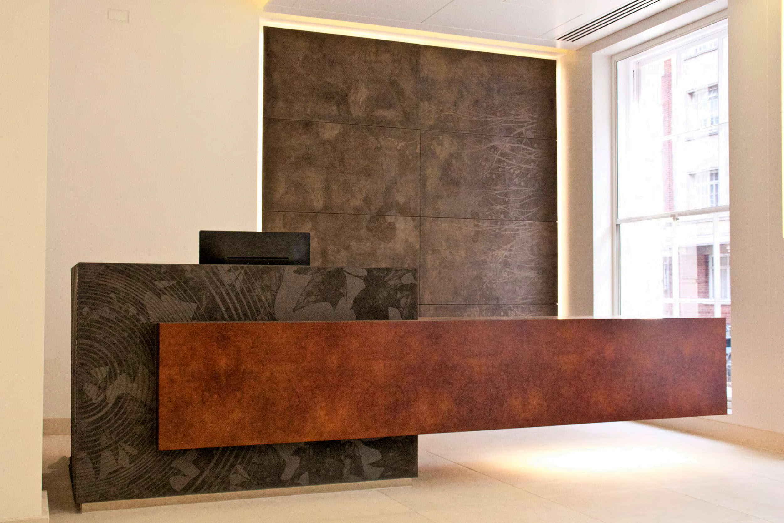 The panels behind the reception desk are ‘bronze’ concrete produced using a blend of cement and powdered bronze which is cast and polished to give a metallic effect..