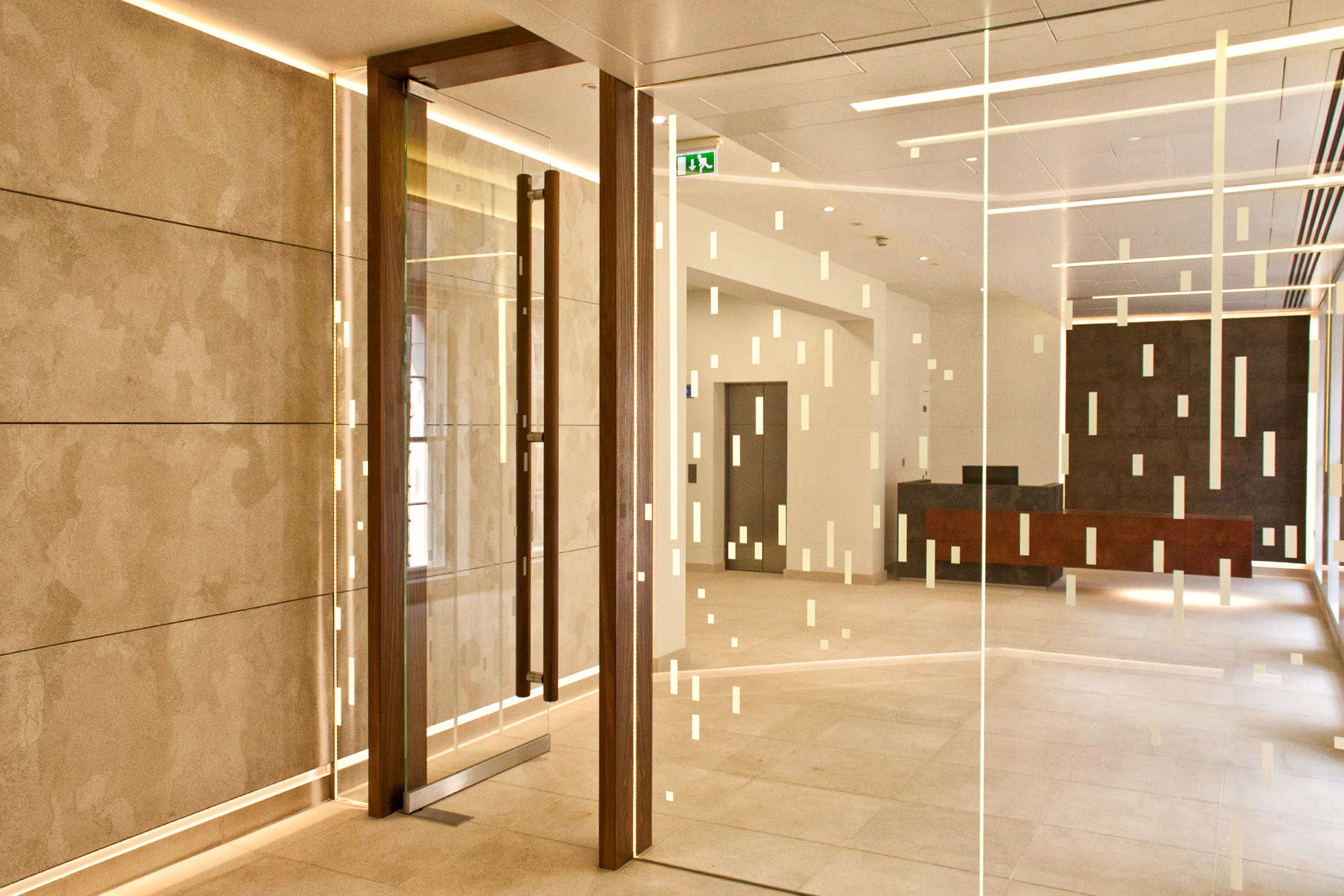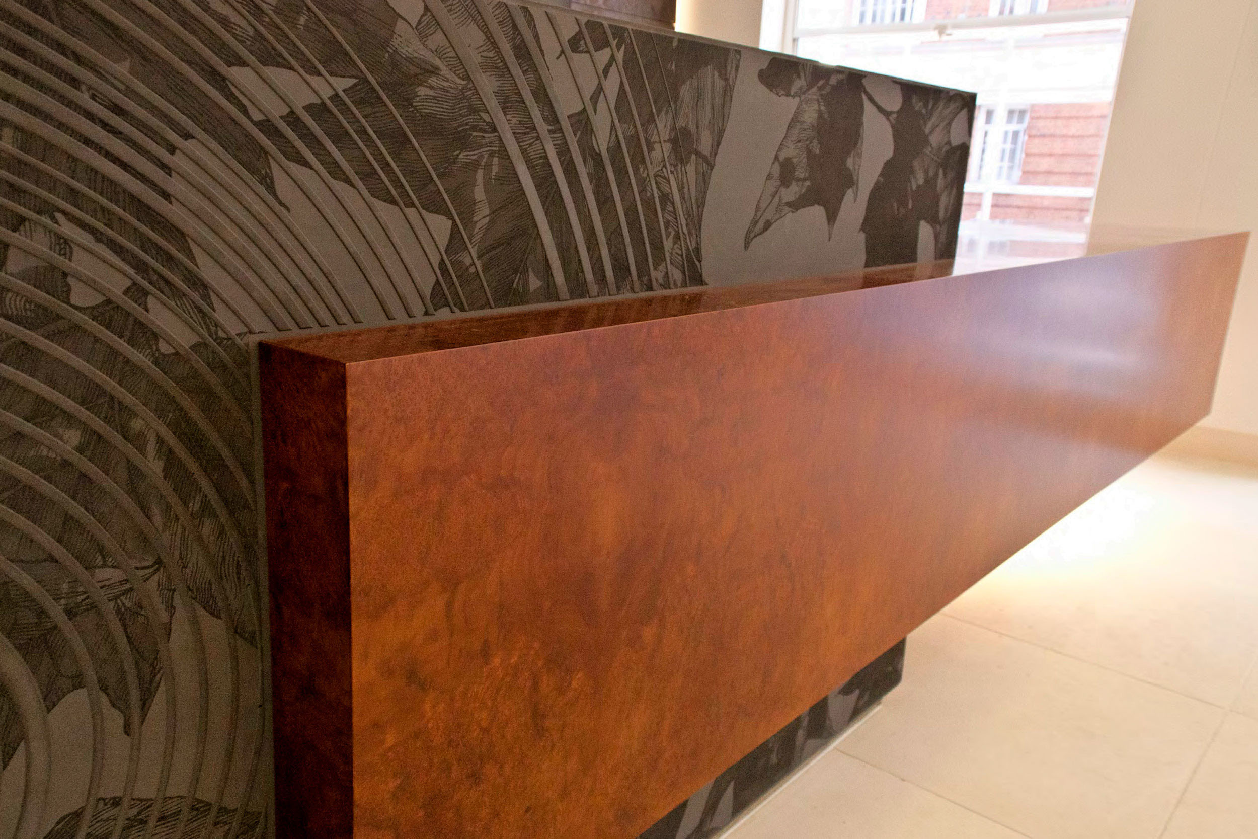 The walls and desk of the reception area feature bespoke abstract patterns based on the bark and fruit of the London plane tree. The artwork was created from photographs of London plane trees and was translated into textures by Graphic Relief. The surfaces are designed so they change as the light changes throughput the day.