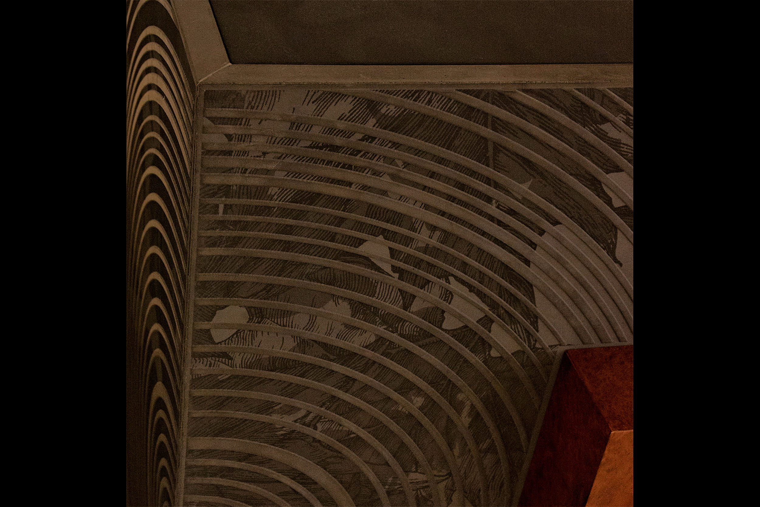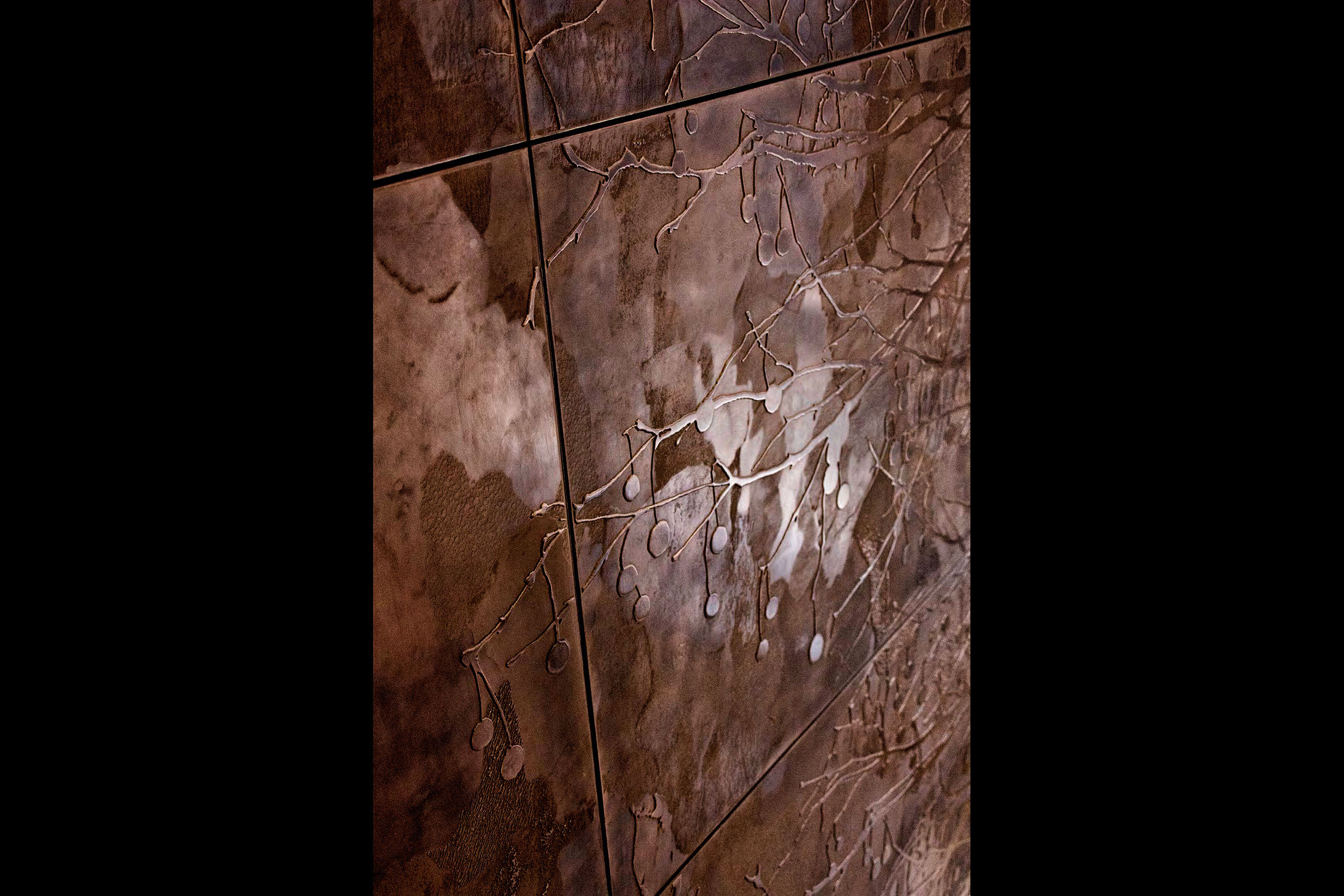 The walls and desk of the reception area feature bespoke abstract patterns based on the bark and fruit of the London plane tree. The artwork was created from photographs of London plane trees and was translated into textures by Graphic Relief. The textured concrete represent the look and feel of the bark, leaves and fruit of the plane tree and the surfaces are designed so they change as the light changes throughput the day.