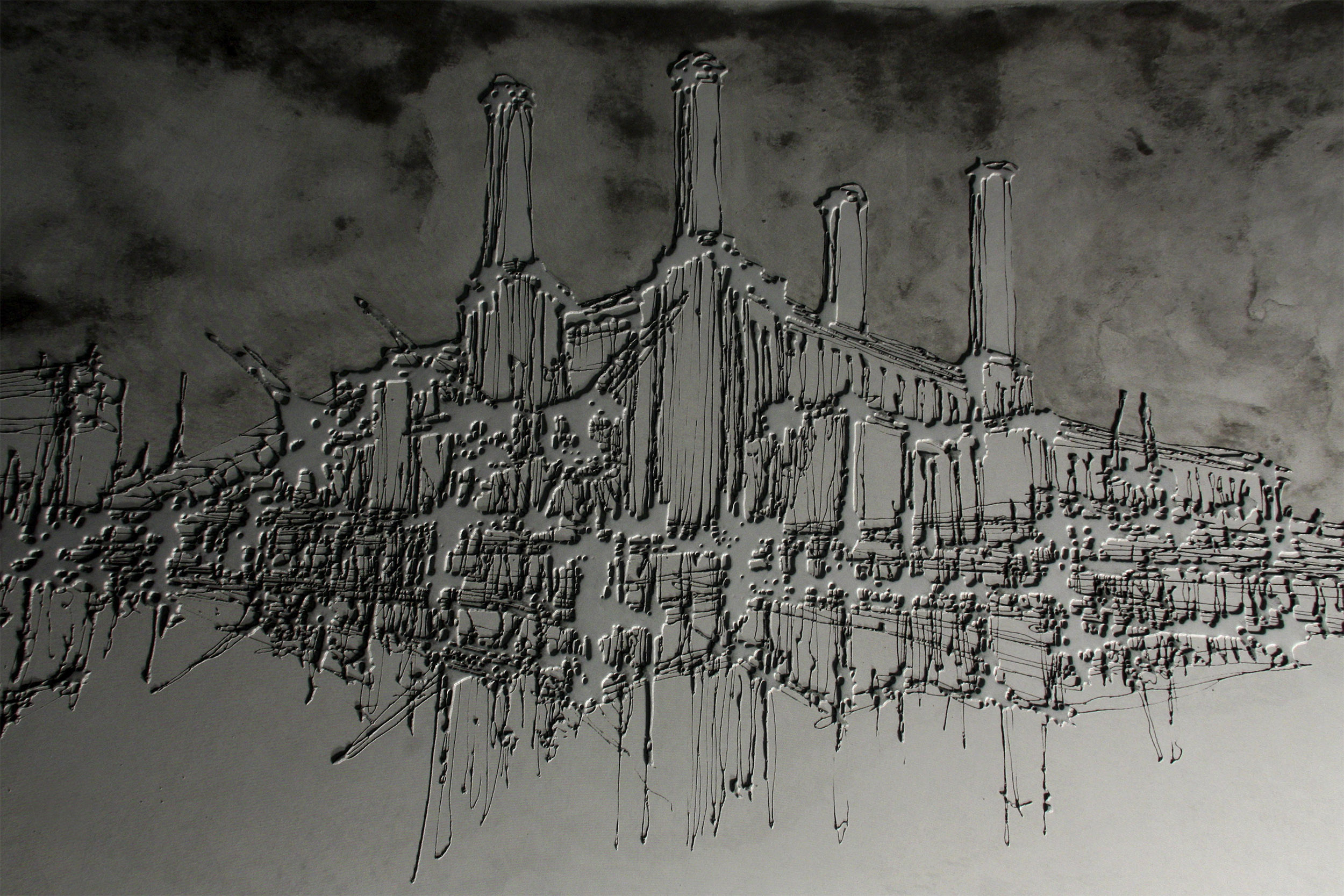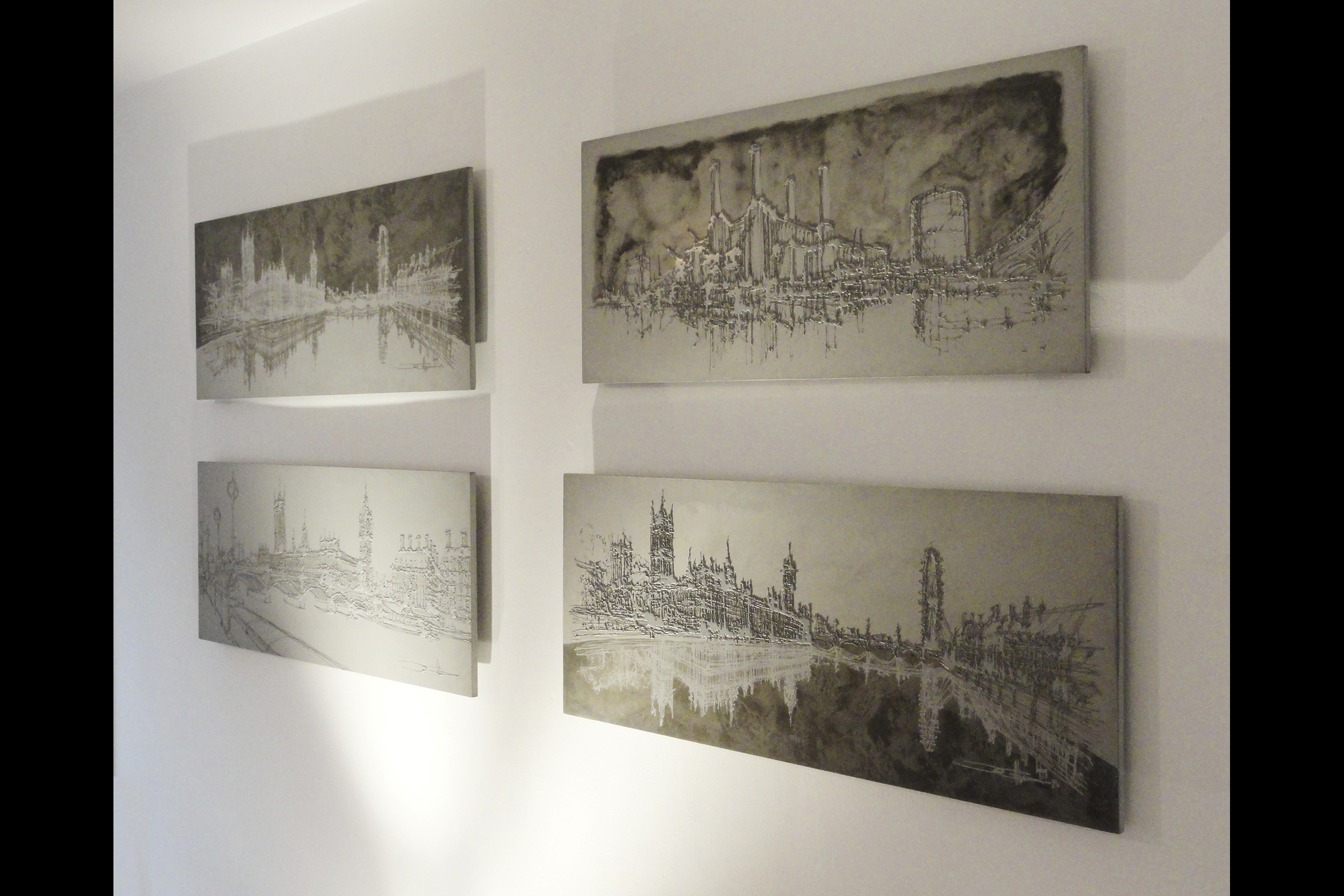 The exhibition was a collaboration between Ingo and Graphic Relief. Ingo works by drizzling acrylic paints on large canvasses to give a fluid, organic effect. Working from digital copies of the canvasses we manufactured mould which recreated this fluidity in the surface of the concrete.