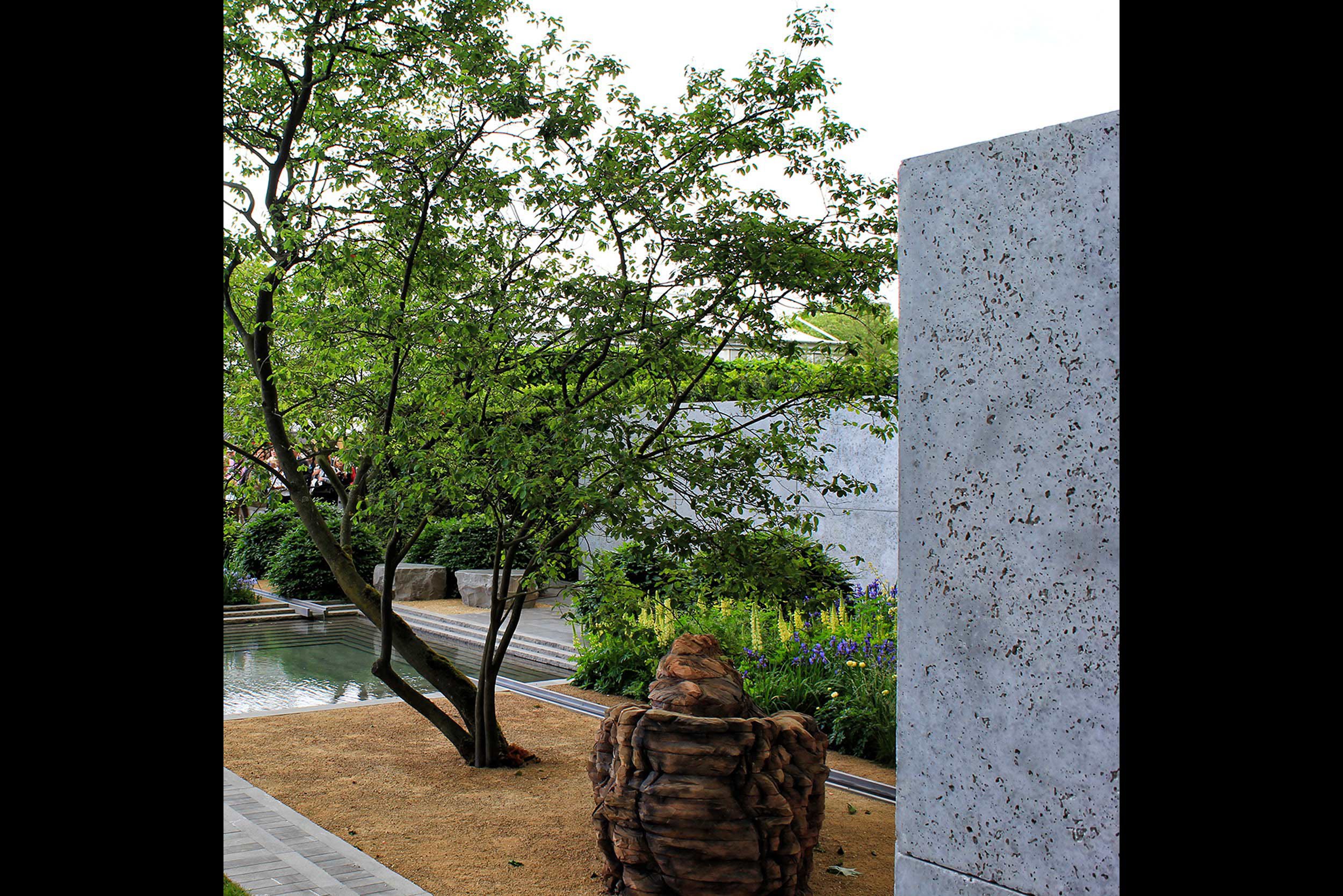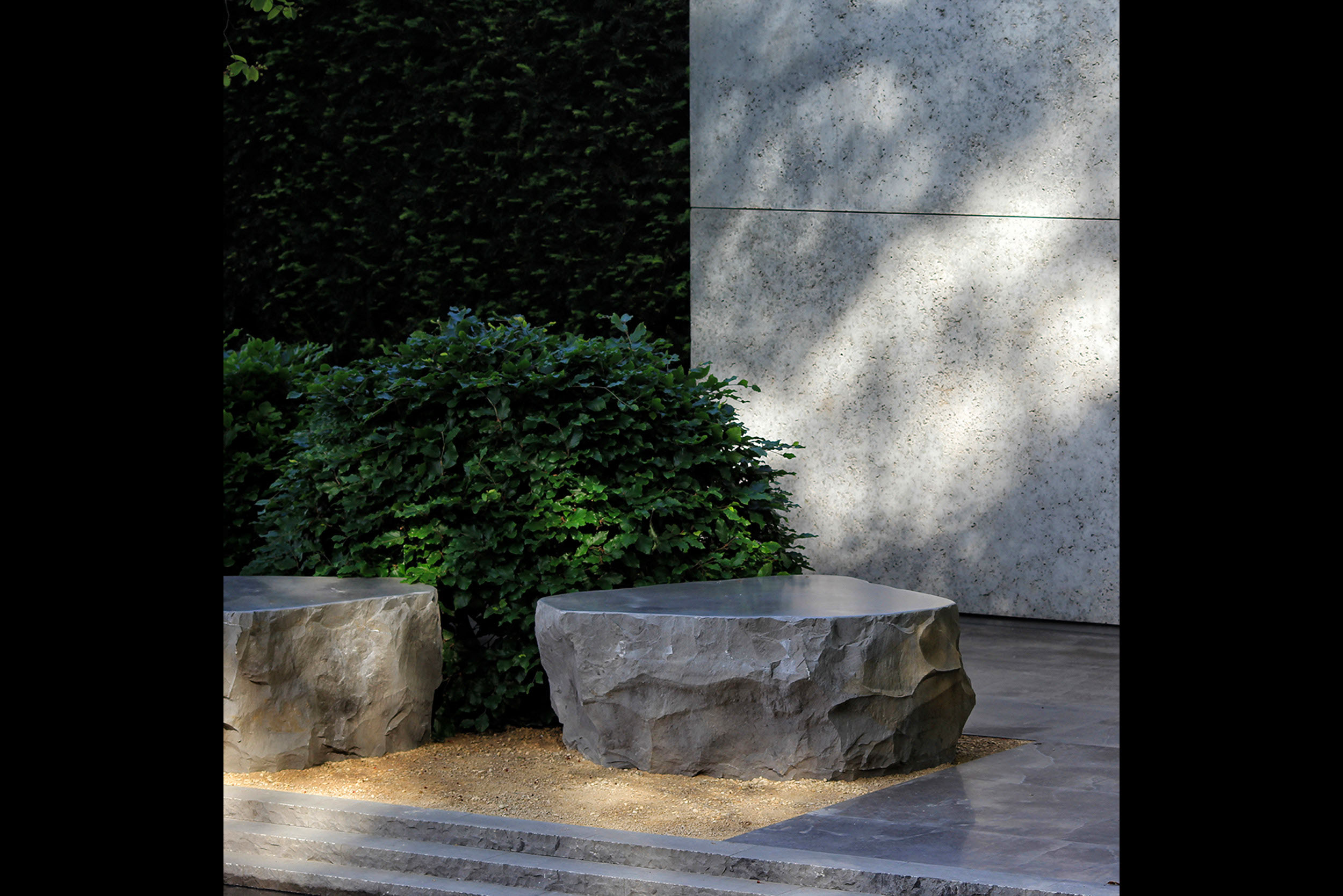 We supplied two large concrete walls for the Laurent Perrier garden. The first provides the backdrop to a patinated sculptural metal panels, the second provides a contrasting background to a sculpture by Ursula von Rydingsvard. e second wall includes a patinated metal edge detail which makes artistic reference to works by Carlo Scarpa (1906-1978).
