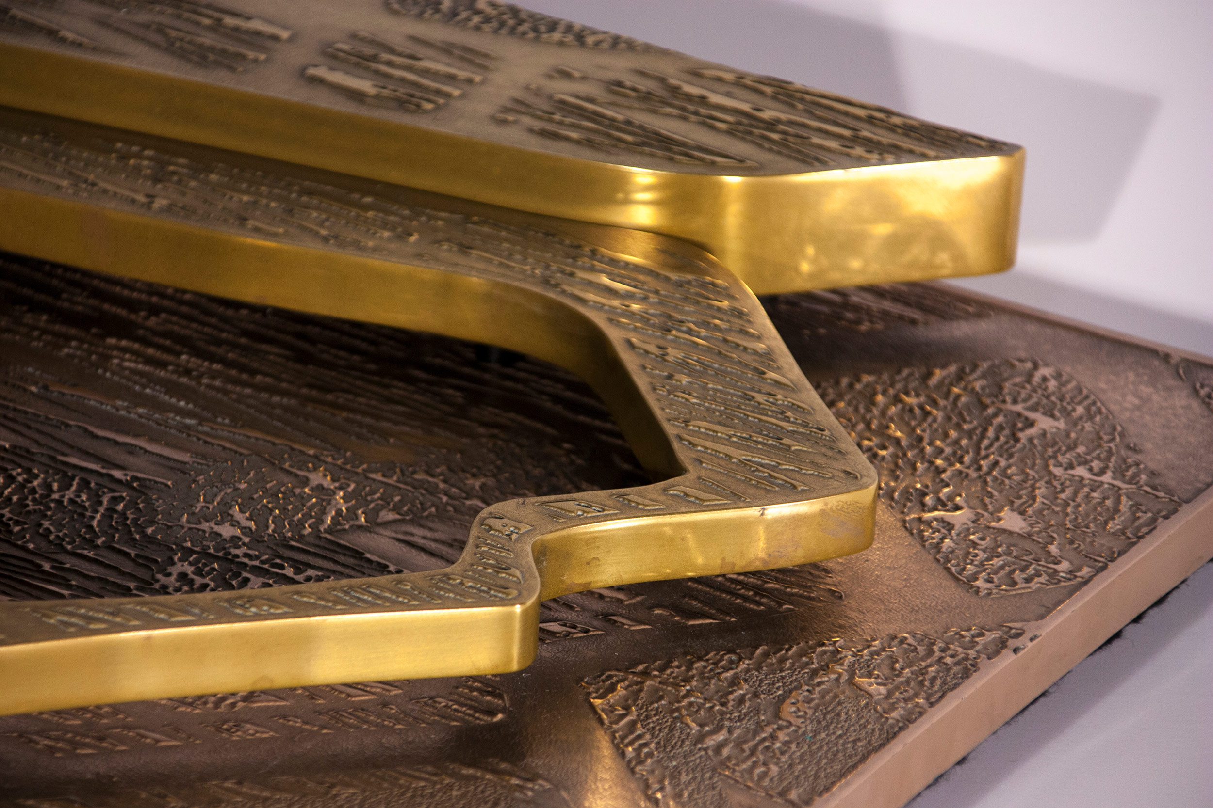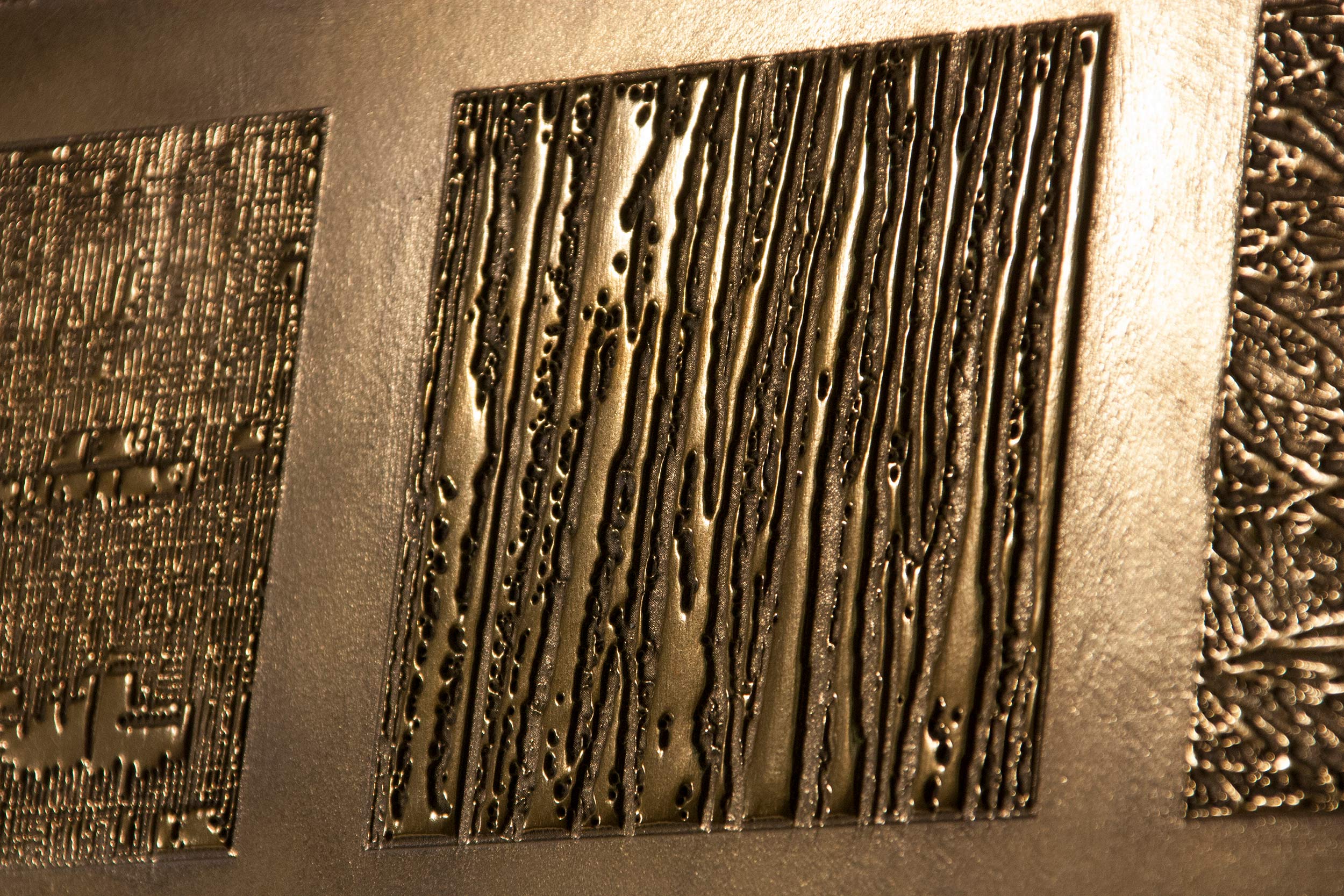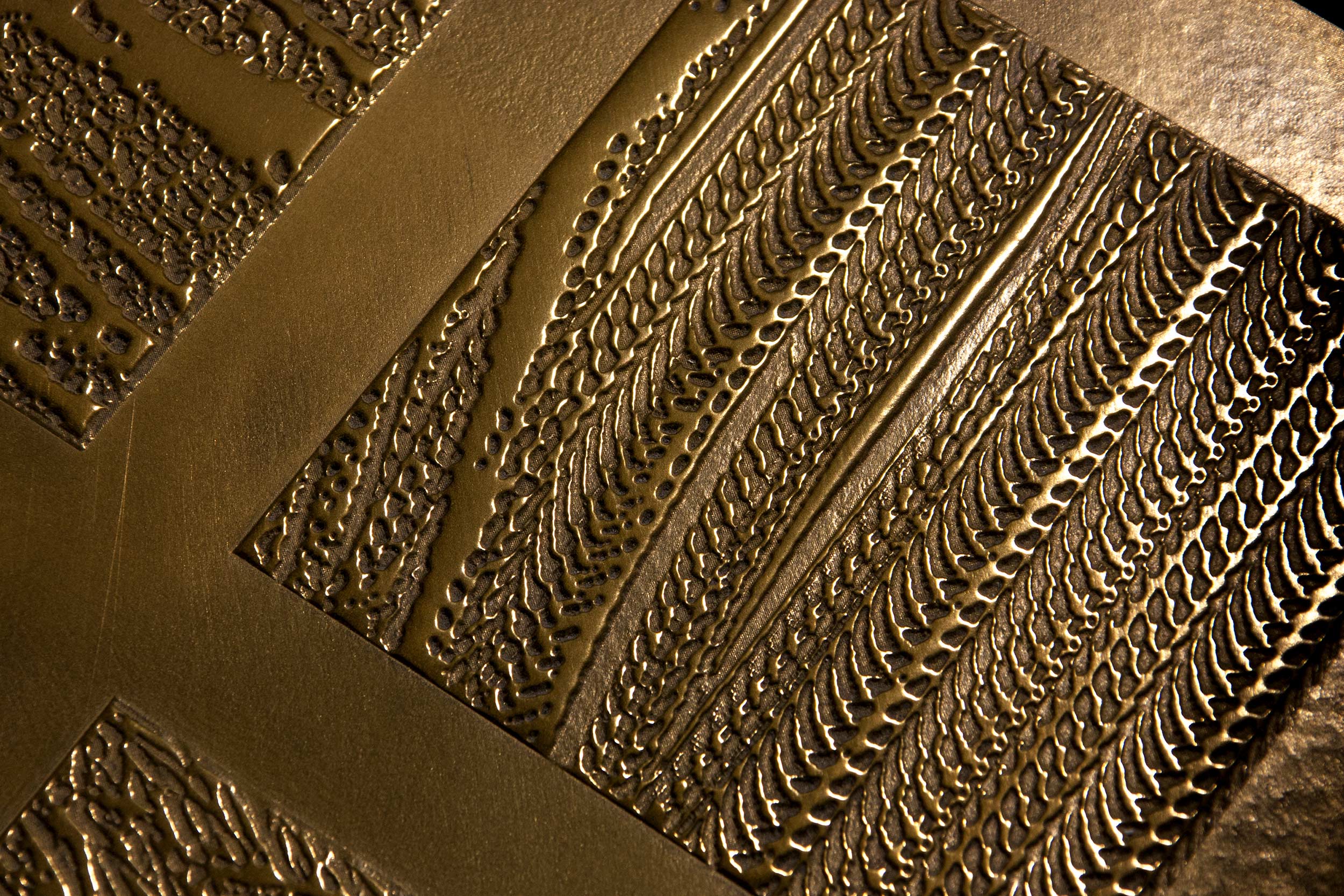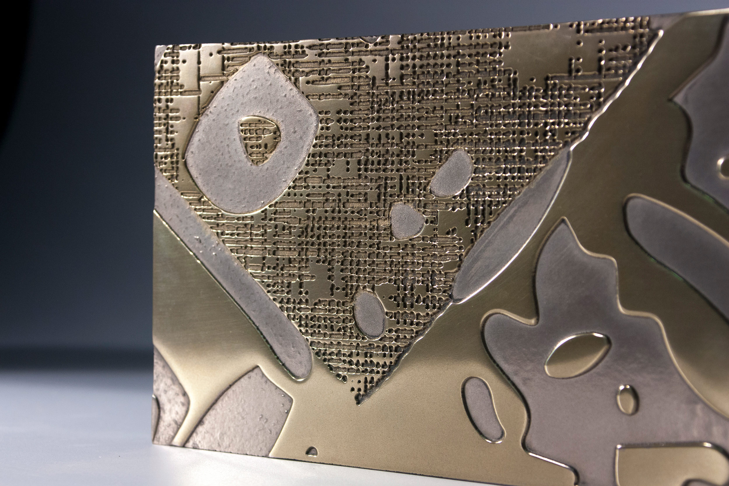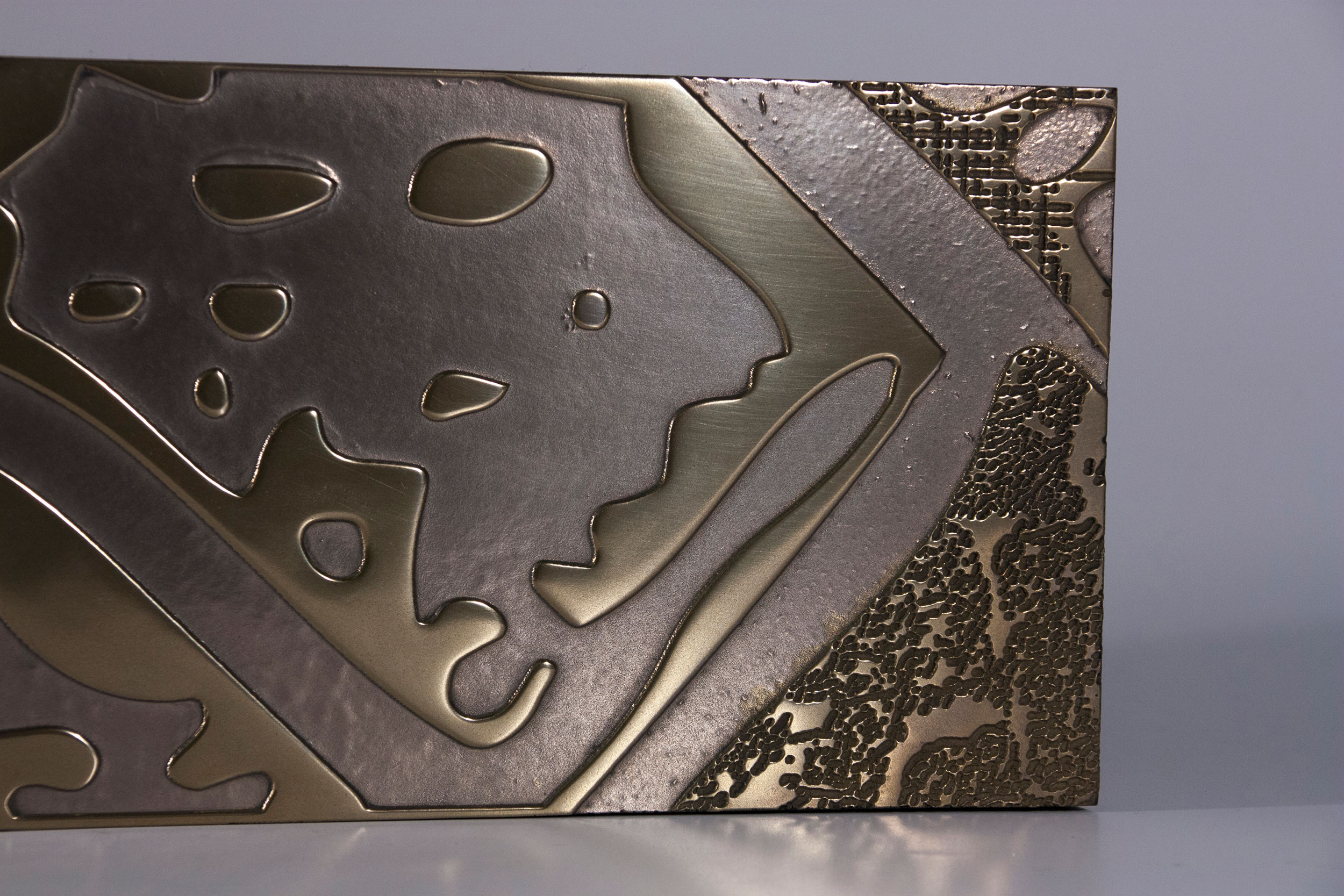 We have produced cast aluminium, bronze and zinc surfaces. For a prestigious fashion house we produced over 180m2 of sandcast aluminium surfaces which were textured and finished with a bronze finish.